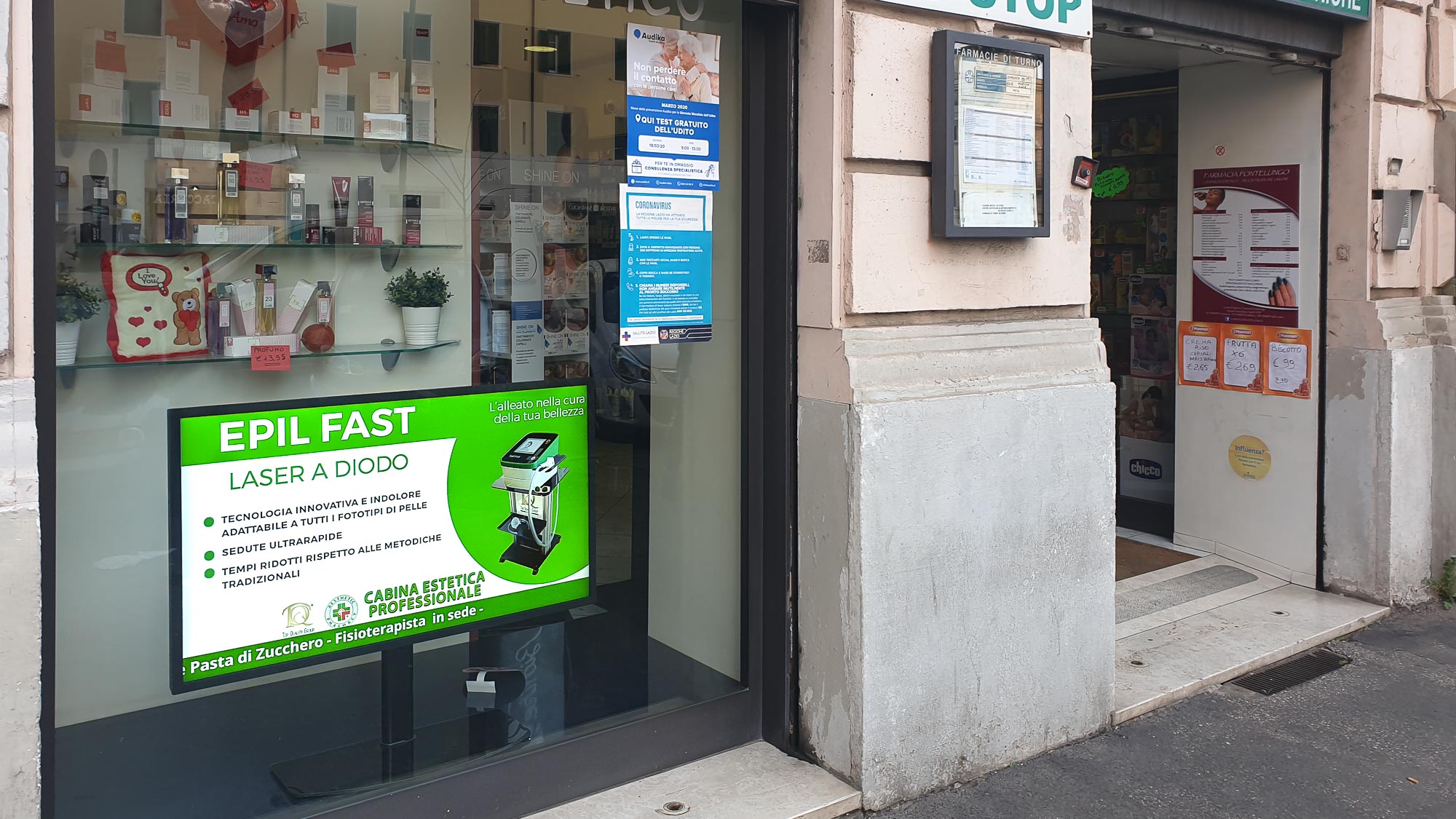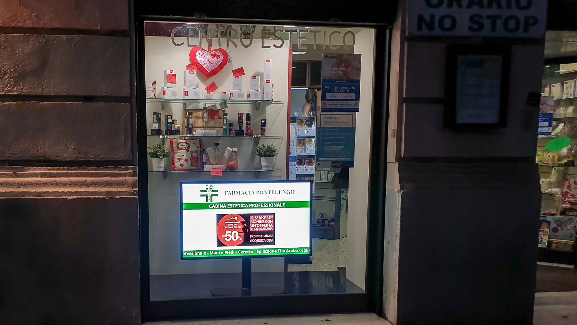 All’interno della vetrina della Farmacia Pontelungo di Roma, abbiamo installato un display ad alta luminosità da 4000 candele (nits), con diagonale 46 pollici e risoluzione Full HD. In questo modo, la vetrina della farmacia, presenta in tempo reale le ultime novità sui prodotti ed i servizi offerti. La grande luminosità del display, consente di vedere chiaramente i contenuti esposti, anche di giorno e con esposizione alla luce solare diretta.