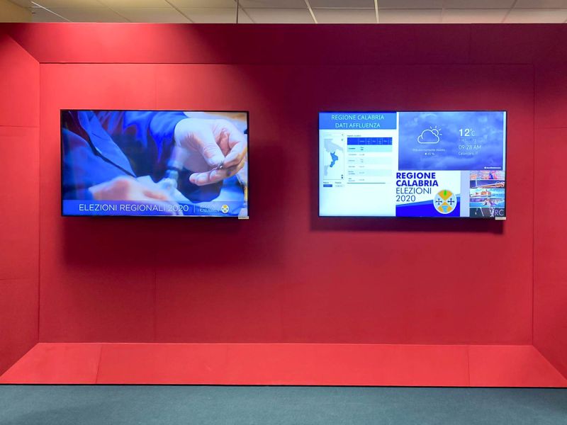 Per la sede della Regione Calabria, in occasione delle elezioni 2020, abbiamo installato, in collaborazione con la società Multiservizi Tecnologici di Catanzaro, 6 monitor Samsung Signage da 65 pollici, utilizzati per la trasmissione in diretta degli exit poll e di tutte le altre informazioni inerenti il voto.